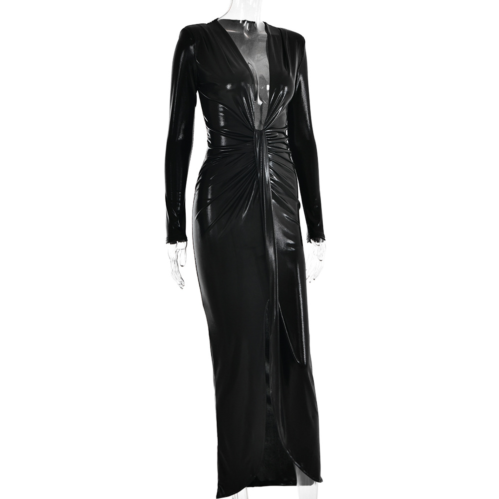 Style: Sexy Fit: Slim Fabric: Polyester Pattern: Non Element: Ruched,Split Neckline: V-Neck Sleeve Type: Regular Sleeve Length: Long Sleeve Product Type: Bodycon Dress,Split Dress,Maxi Dress Occasion: Party & Club Dress/Skirt...